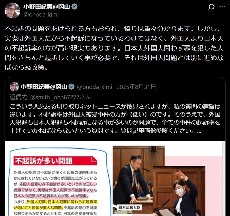 担当大臣の小野田氏に至っては「肝心なことには答えず強い言葉で言い訳する」という「中革連・安住淳病末期」だ。「外国人より日本人の方が不起訴率が高い」という小野田氏の欺瞞を明らかにする。